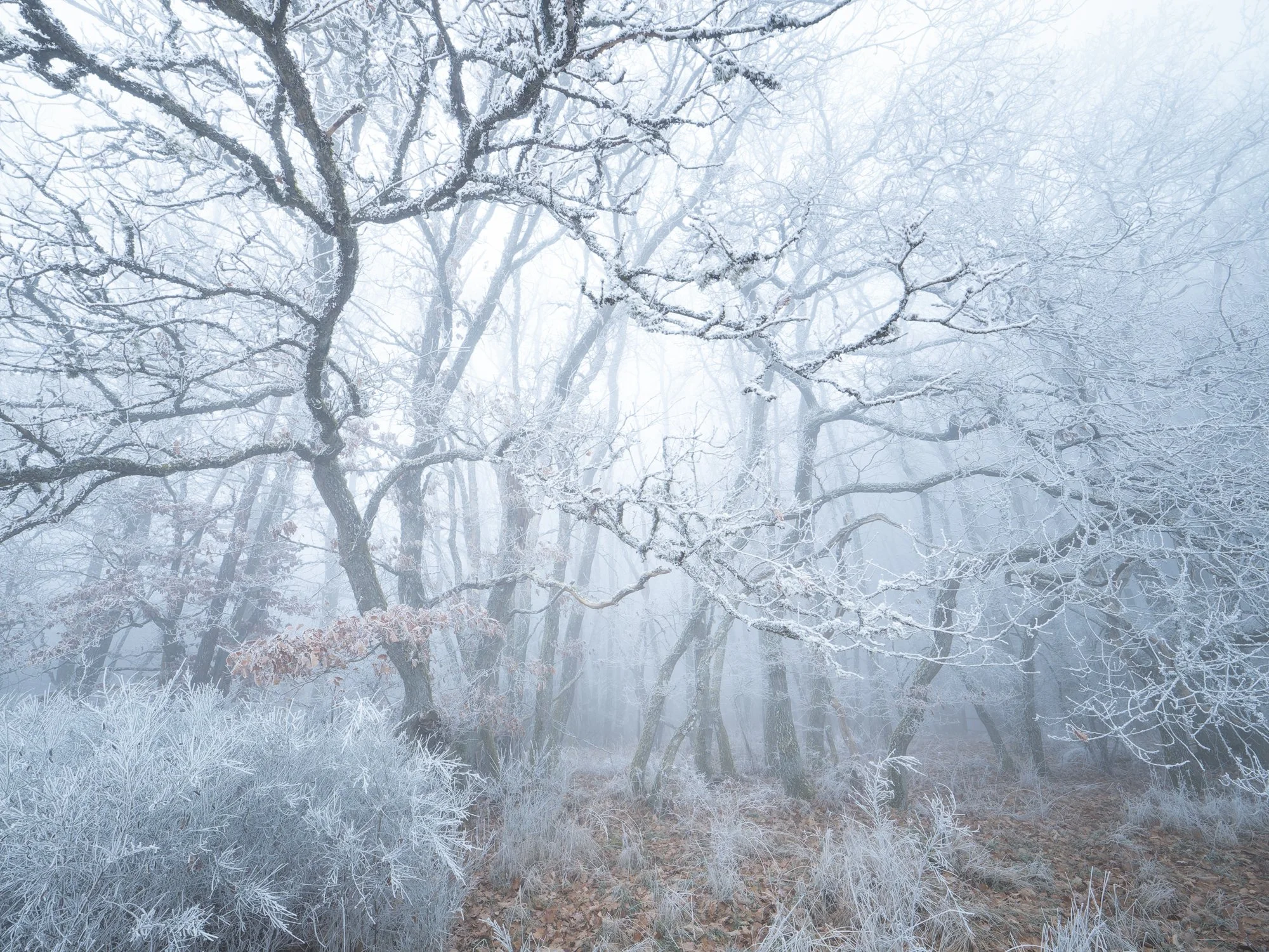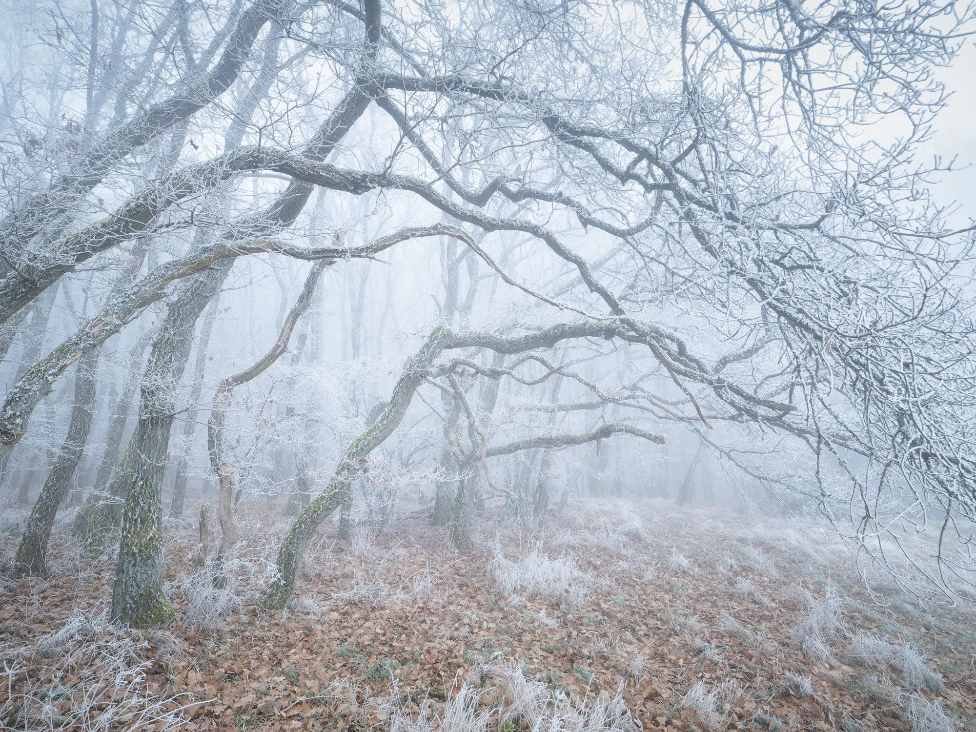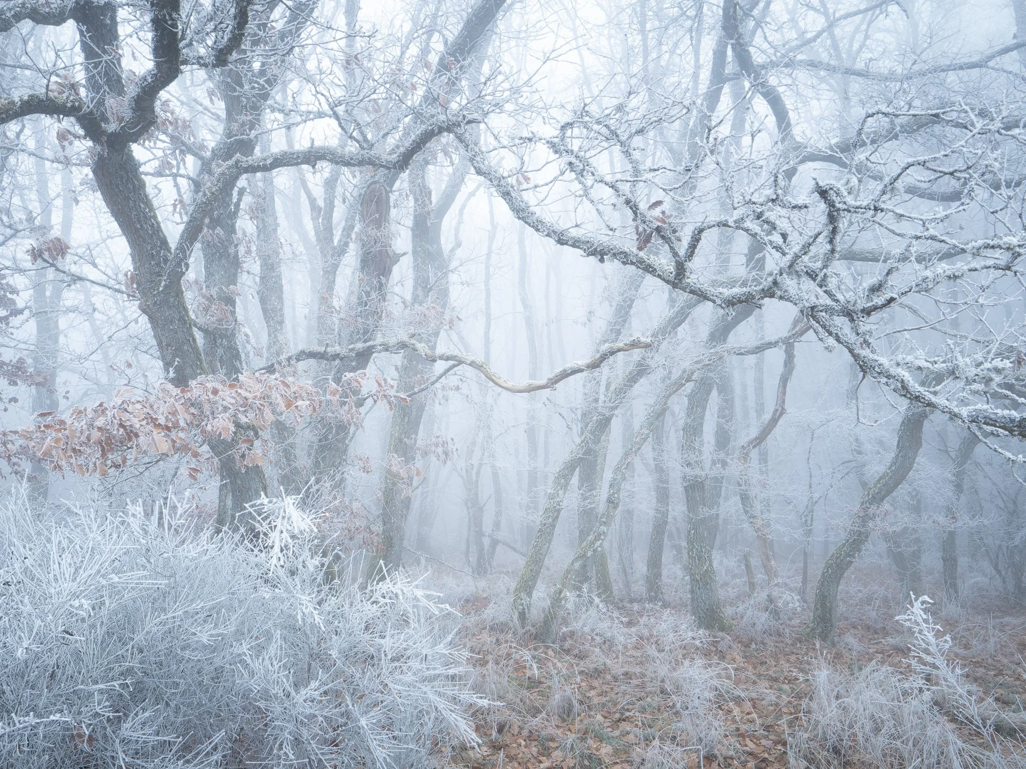Und so zieht es mich auch an diesem Morgen wieder zu meiner Lieblings-Baumgruppe, die sich über die Nacht in ein frostig-weißes Kleid gehüllt hat. Während der Wind den eiskalten Nebel durch den Wald jagt, versuche ich mit altbekannten und neuen Perspektiven die ganze Schönheit der Szenerie einzufangen. Immer wieder friert mir dabei der Kugelkopf meines Statives ein, weil mein Atem beim Blick durch die Kamera eine dünne Eisschicht auf der Metalloberfläche des Kugelkopfes hinterlässt. Die nebelfeuchte Eiseskälte macht vor nichts halt. Sie durchdringt jede Pore in Kleidung und Haut. Doch all das blende ich aus – das Fotofieber hat mich gepackt!