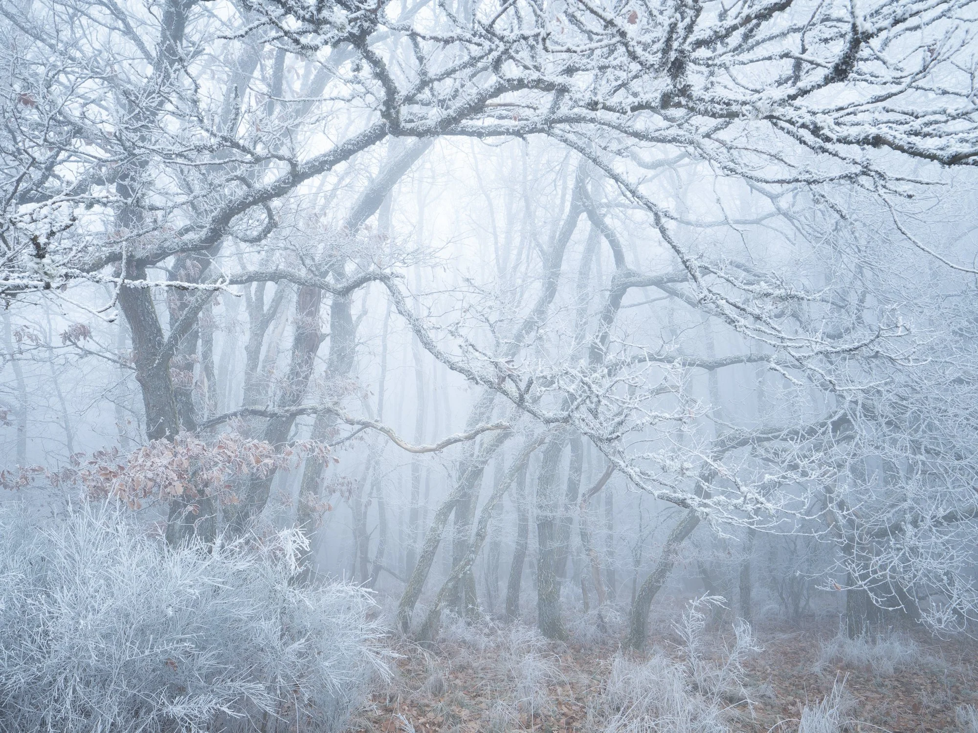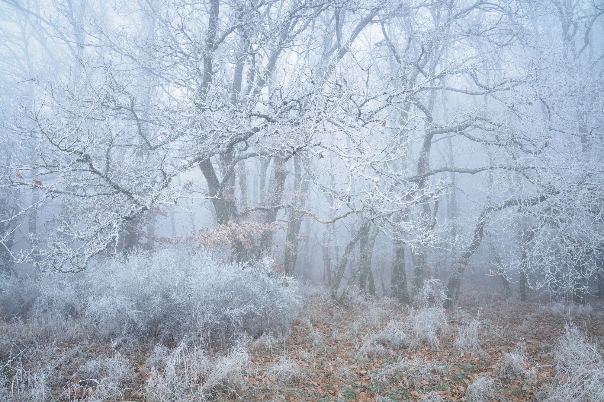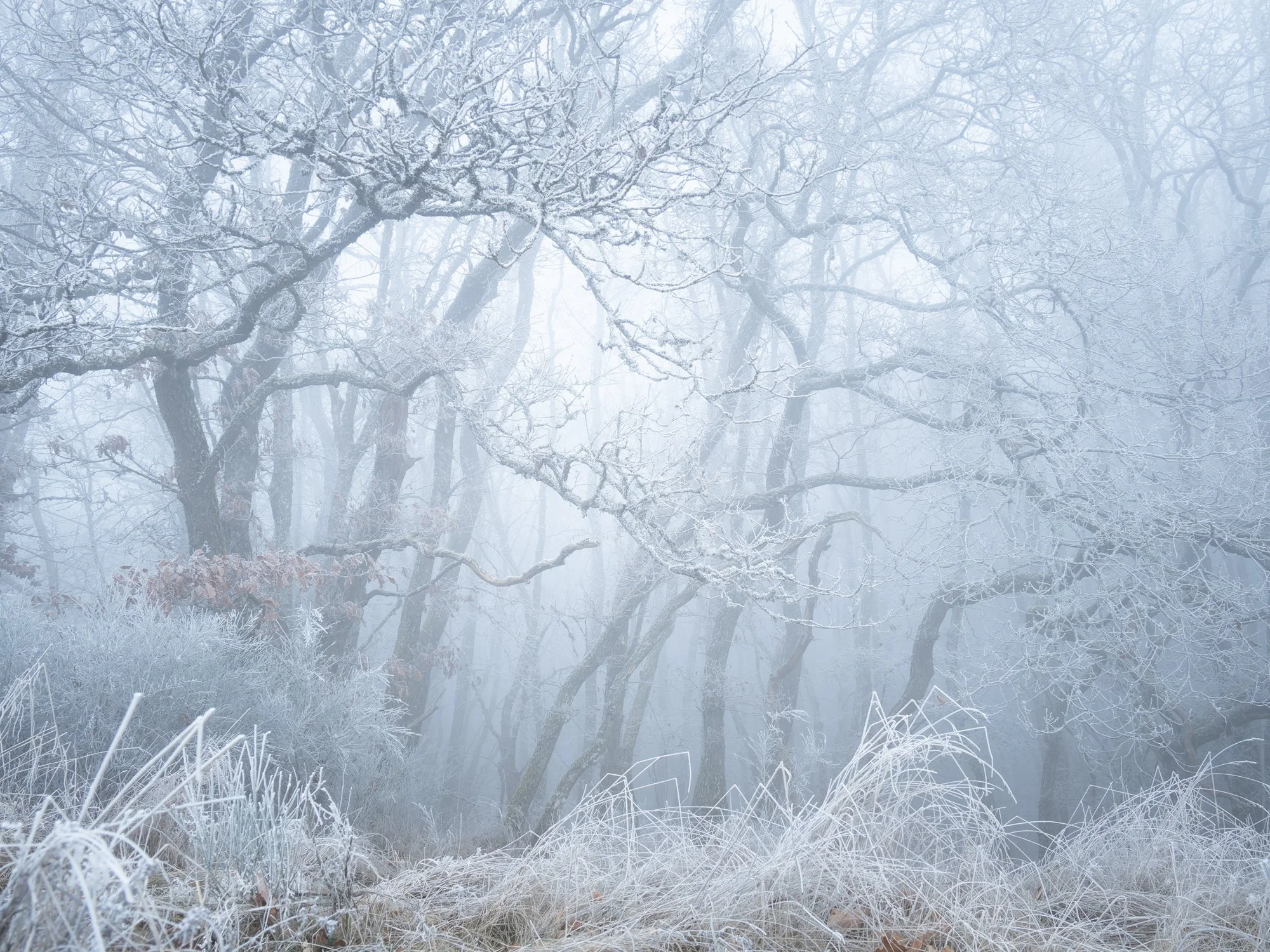 Und so zieht es mich auch an diesem Morgen wieder zu meiner Lieblings-Baumgruppe, die sich über die Nacht in ein frostig-weißes Kleid gehüllt hat. Während der Wind den eiskalten Nebel durch den Wald jagt, versuche ich mit altbekannten und neuen Perspektiven die ganze Schönheit der Szenerie einzufangen. Immer wieder friert mir dabei der Kugelkopf meines Statives ein, weil mein Atem beim Blick durch die Kamera eine dünne Eisschicht auf der Metalloberfläche des Kugelkopfes hinterlässt. Die nebelfeuchte Eiseskälte macht vor nichts halt. Sie durchdringt jede Pore in Kleidung und Haut. Doch all das blende ich aus – das Fotofieber hat mich gepackt!