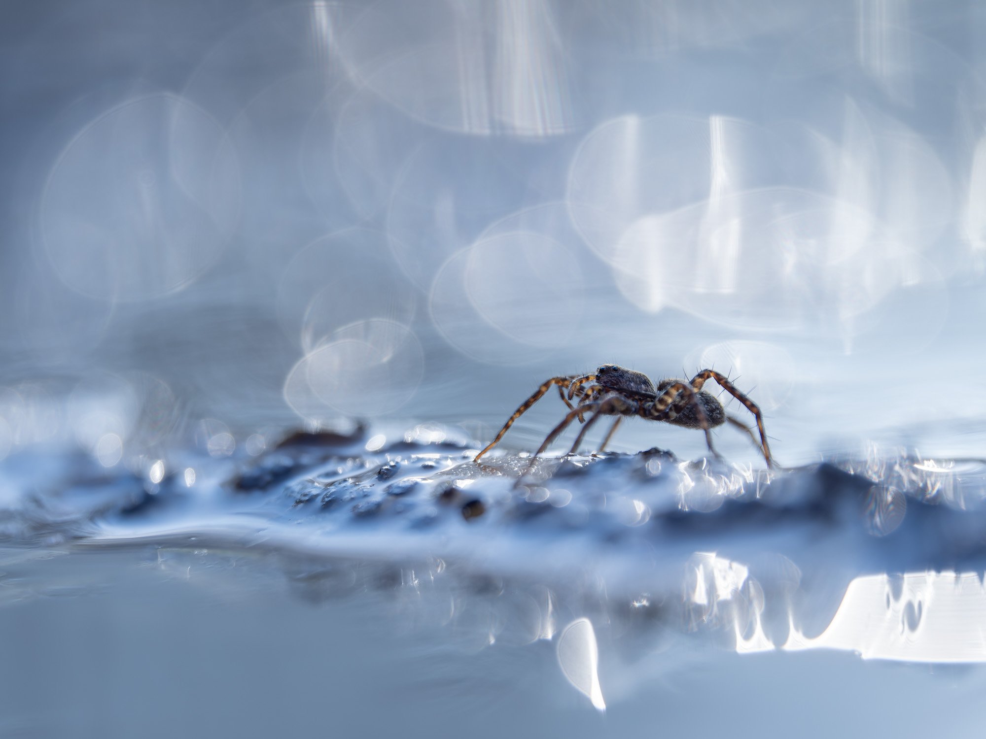 Was macht man, wenn sich alle Kröten wegducken? Man sucht sich neue Motive! So wie diese kleine Spinne, die auf der Suche nach Fressbarem mit ihren acht Beinchen über das Wasser huschte und eine kleine Pause auf einem der vielen umherschwimmenden Pflanzenstängelchen einlegte.