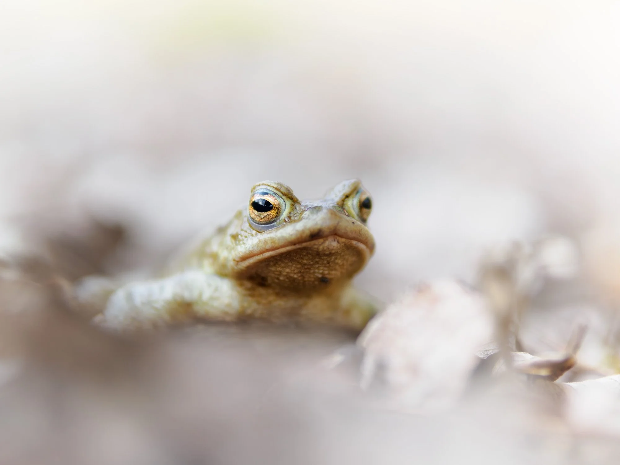 In der Laichzeit sind Kröten offensichtlich blind für alle Gefahren. Sie verlassen immer wieder den Tümpel und verfolgen sogar den Fotografen. (Einer ist mir sogar gegen die Frontlinse meines Objektivs gesprungen!) So kann man auch außerhalb des Gewässers zu schönen Bildern kommen.